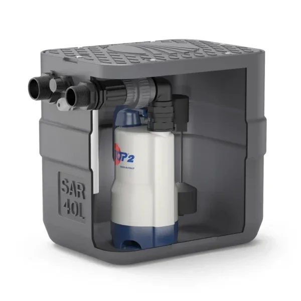 Las estaciones de acumulación y elevación SAR 40 son adecuadas para recoger y elevar aguas claras, pluviales y residuales de desagües domésticos como lavadoras, lavavajillas y fregaderos, donde la red de alcantarillado está demasiado lejos o no se puede llegar por gravedad.
